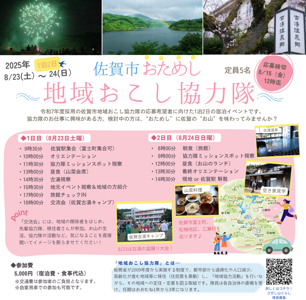 今年の夏も「佐賀市おためし地域おこし協力隊1泊2日イベント(8/23~24)」を開催します!ぜひこの機会に協力隊の活動や、佐賀市山間地域のことを知ってみませんか? ご不明などございましたらお気軽に問い合わせください。たくさんのご応募をお待ちしております!